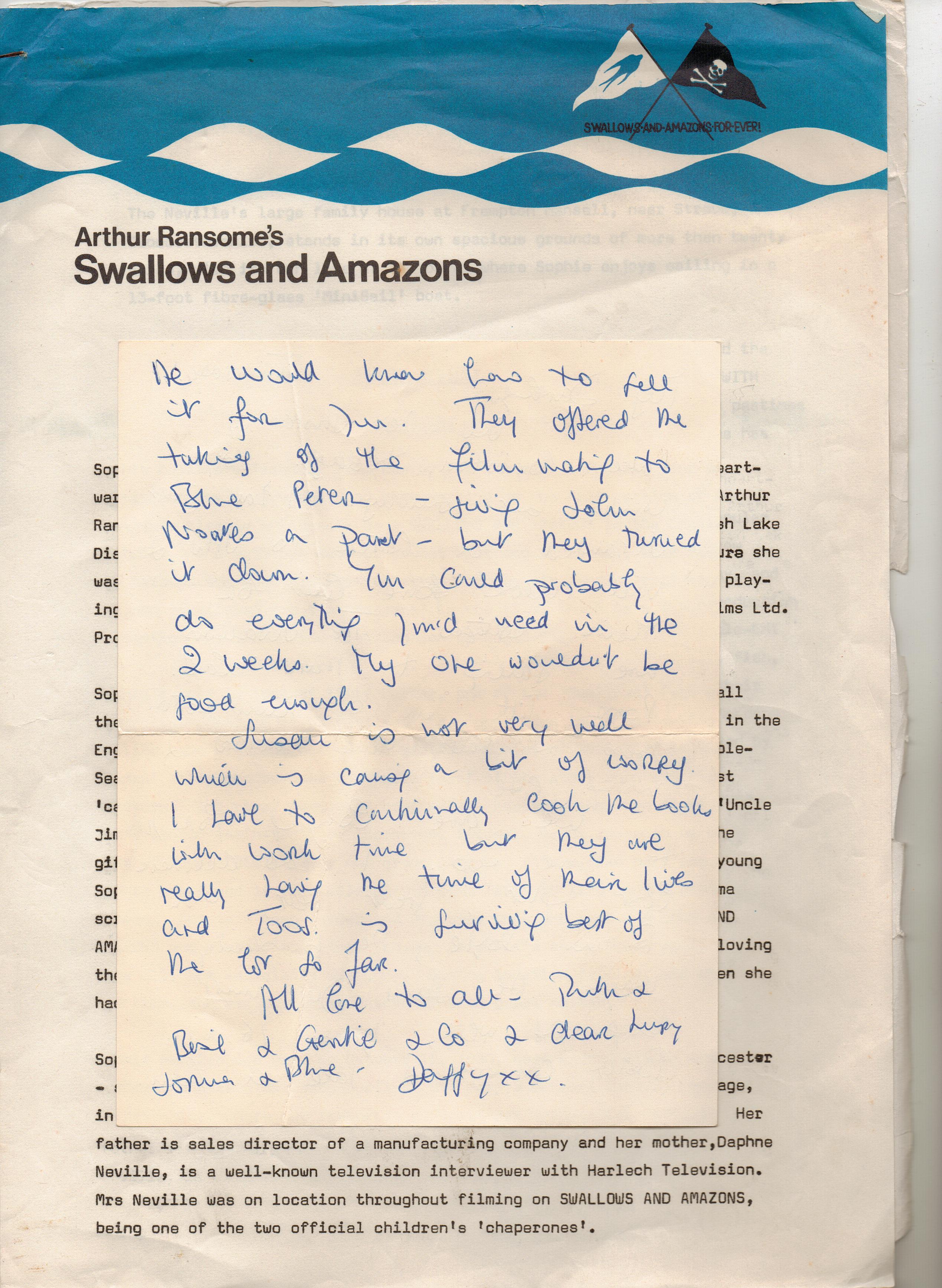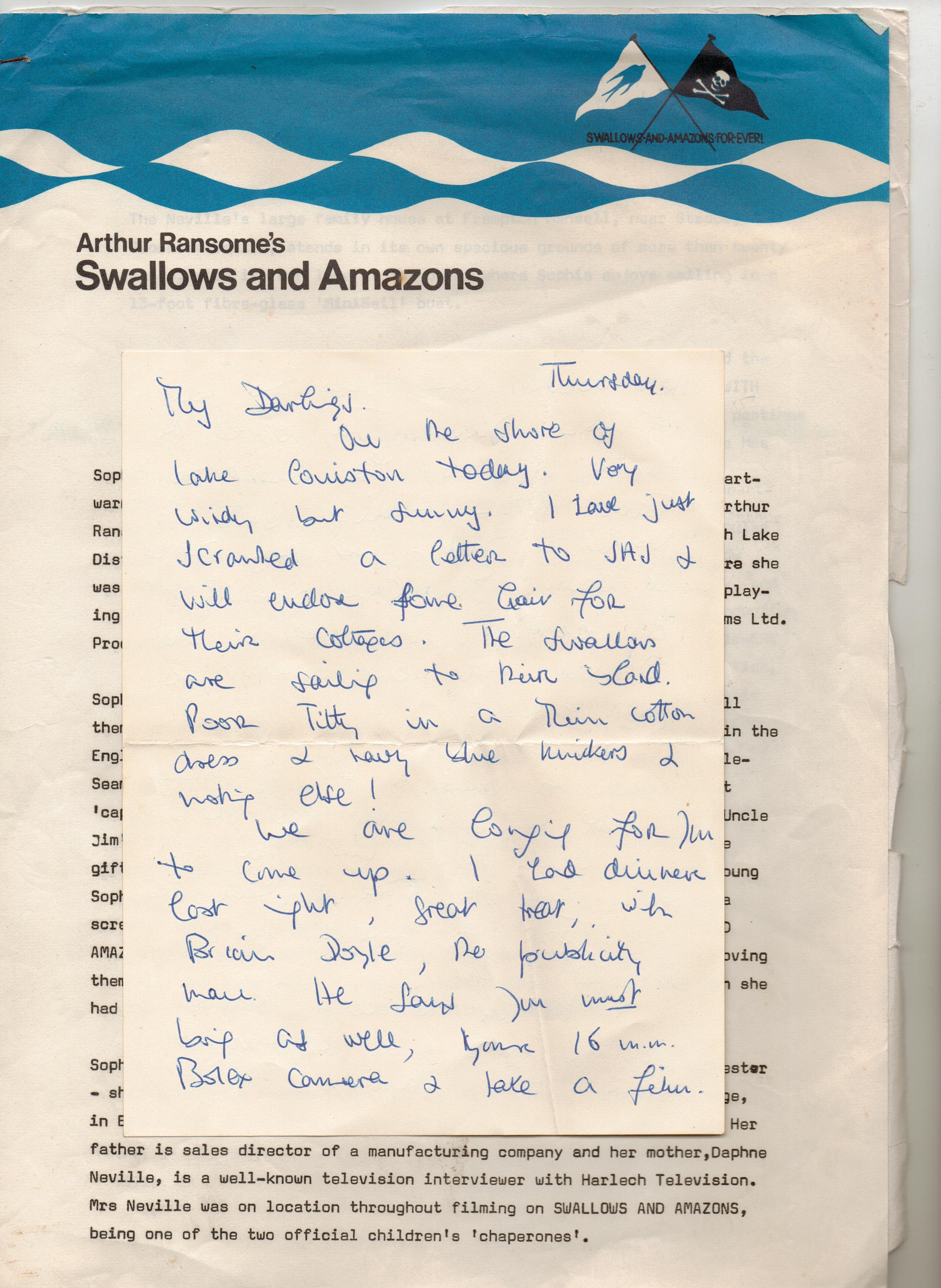 1. Hello Sophie – I’m Brian Doyle’s daughter, Pandora. The Lake District was wonderful. Dad got me a couple of weeks as an extra. I tried to contact Daphne a few years ago to tell her dad died very suddenly in January 2008 the day after Heath Ledger. That’s a good photo of Brian. I still have stills of you and the other actors and also kept some sort of diary on the same Swallows and Amazons headed paper. I have just come accross your site and will have a closer look. Please let your mum know about Brian. I met you again at The Putney Show with the lovely otters. Pandora.