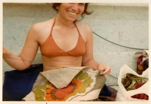 I don’t know why Kit was blinking. She didn’t wear contact lenses and would not have been nervous. We may have had more lights out on Peel Island than earlier in the season. As you know, it is quite dark under the trees where our tents were pitched. Lee Electric somehow managed to bring over and power enough lights to bring in the sunshine. These can not be seen on most photographs but you can get an idea from the shots my mother took when Virginia McKenna was being Man Friday. I had grown used to them by this time and enjoyed the warmth they produced.