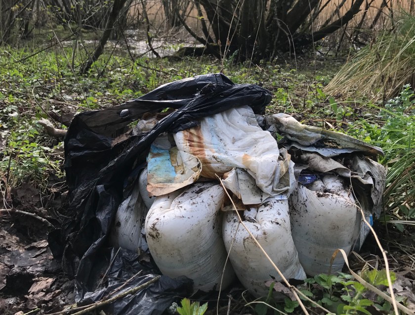 There was also a large bag of incontinence pads (unused). Being absorbent these had filled with water and expanded in a grotesque manner as I tried to lift the sack. They were so heavy it was all I could do to swing it towards my car. I had to use two bags from the council to contain the load. Why were all these things these dumped in a wood?
