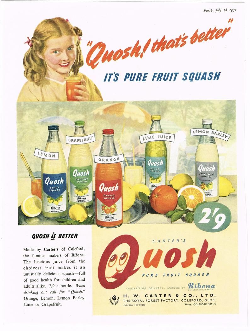 Made by Carter’s of Coleford who produced Ribena, Quosh was advertised as originally costing 2’9d, a ‘pure fruit’ squash, no less.