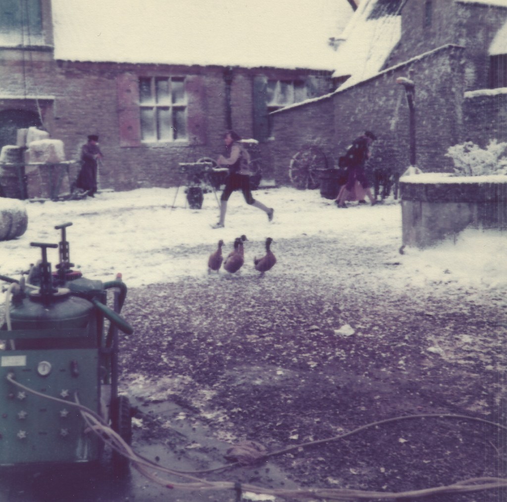 The only difficult thing was coping with the cold. It was freezing and I was dressed in very little. No thermal vest or longjohns were provided. The peculiar item in the left hand side of the photo above is a snow machine. Real snow would not have been unexpected. Patrick Dromgoole was sympathetic and offered moral support as we waited for camera track to be laid.