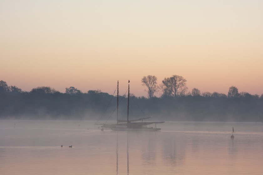 I woke early on the Sunday morning to find mist hanging above the water as the sun was rising on what proved to be another sunny day with a fair wind for sailing.