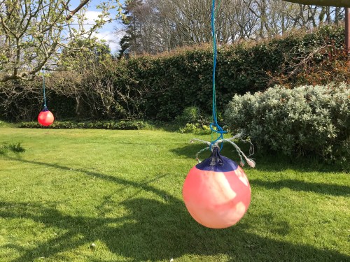 Our garden has become a retirement home for old buoys. As the school holidays began small children arrived, intent on pestering them. While dear old Mr Puce tolerates being punched, kicked and swung on, Miss Black, a fender who I found washed up on the shore, has a new role as a swing seat. I’m growing quite fond of her.