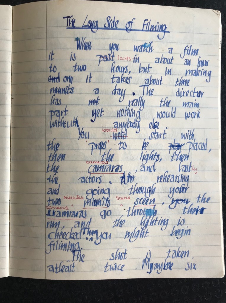I came across an essay in one of my school exercise books that I must have written aged twelve whilst on location. I was trying to explain that only about three minutes of what will be the finished film are captured during a long day’s filming on location. The piece is not well written.