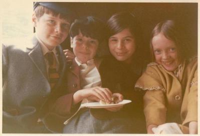 The cast of Swallows and Amazons with Virginia McKenna at Bank Ground Farm in 1973