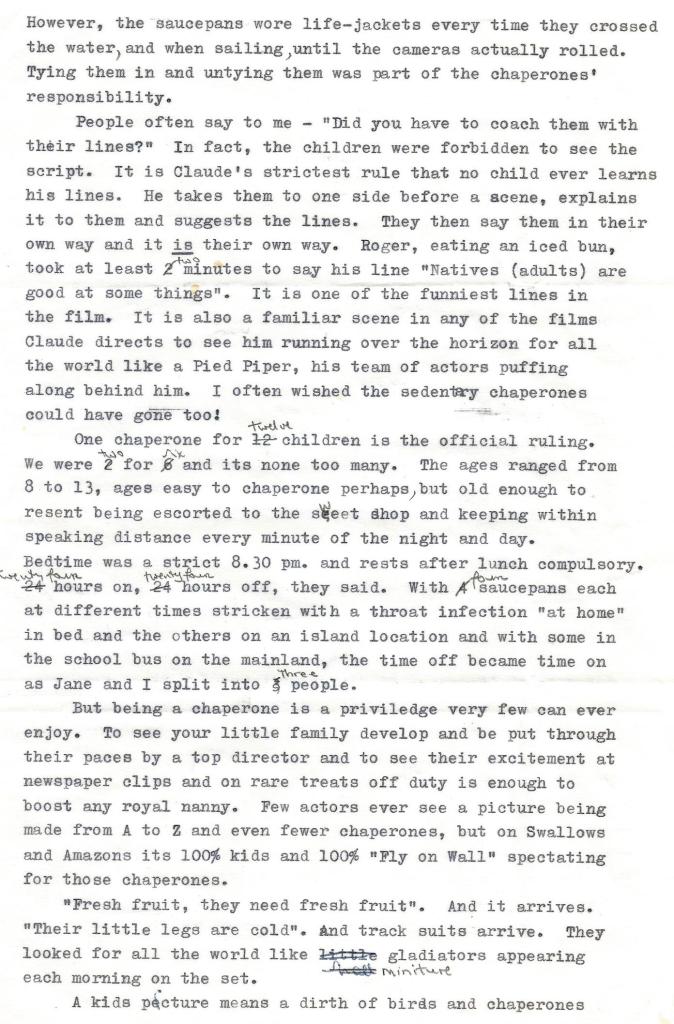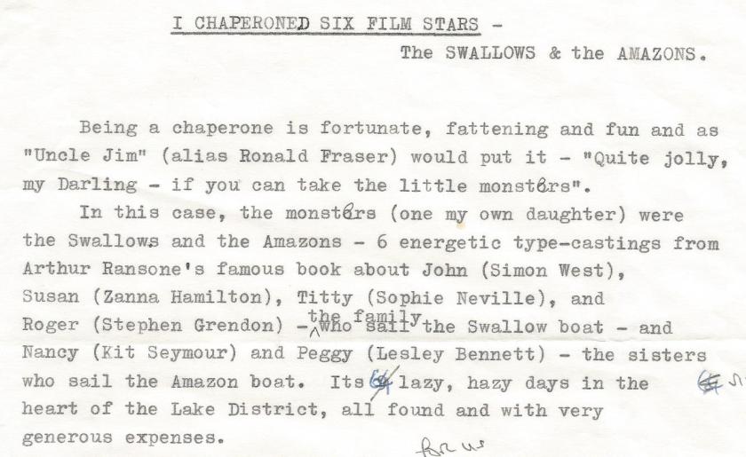 In the feature film ‘Swallows and Amazons'(1974) the part of Peggy Blackett was played by Lesley Bennett. She was an experienced dingy sailor and enjoyed the scenes on the houseboat although she told me she didn’t want the parrot to flap onto her shoulder, which was understandable. Its claws dug into mine.