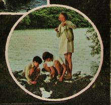 Sten Grendon as Roger Walker being taught to swim by Suzanna Hamilton playing his elder sister Susan Walker on location at Peel Island on Coniston Water in 1973