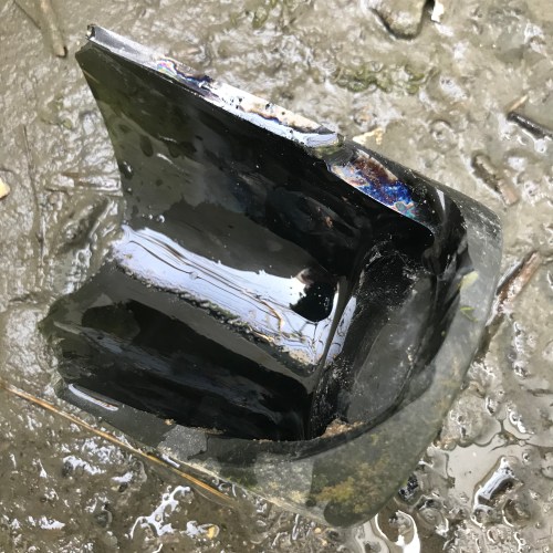 Since New Forest ponies, wildfowl and other animals graze on Solent shores I am keen on collecting broken glass. As there is no wave action, it remains sharp for decades. I can’t bear the thought of swans’ feet being cut. I collected this much in an hour but failed to reach it all.