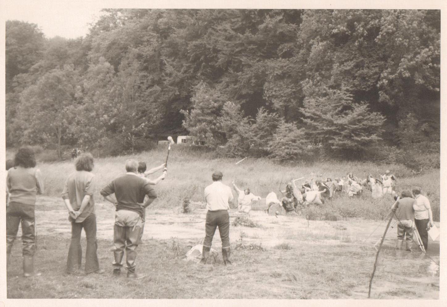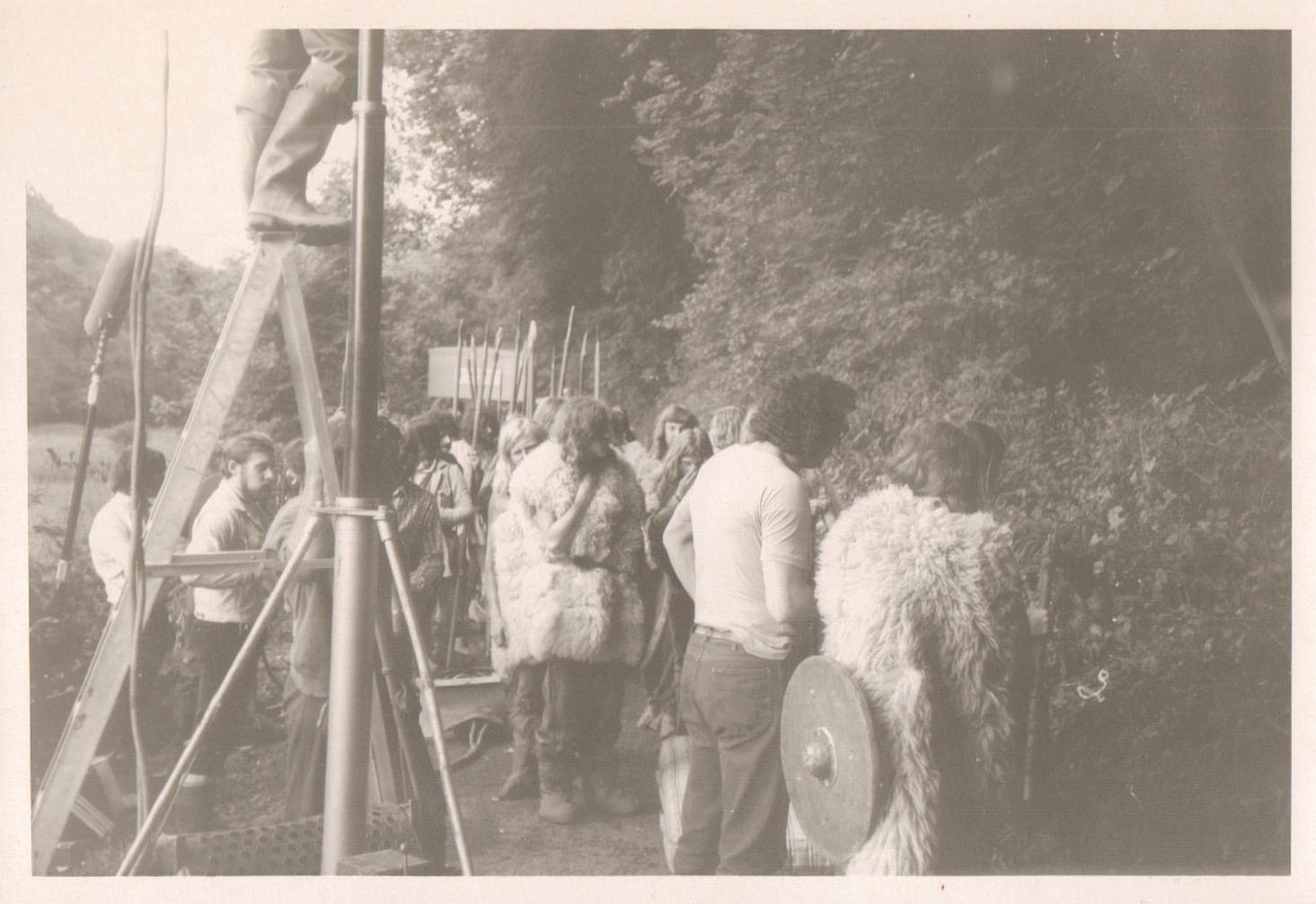 I was on my summer vacation and Bob mentioned HTV were looking for extras for ‘Arthur’ if I was interested. When I arrived on set it seemed that half of Bristol was there including many of my drinking mates from Clifton, most of whom had arrived equipped with cider and beer and it became fairly apparent the direction things would take. A few years ago I was reminiscing about those days with one of them, Mike Dauncey, who went on to become a respected BBC Cameraman, but who sadly, recently died. He told me he spent most of his time in the actors tent, along with a few other reprobates, smoking pot. I recall seeing him at the time but had no idea what was going on, though I remember enjoying plenty of the extraordinary amounts of alcohol that seemed to be around. I’m pretty sure Mike is the guy in the patterned doublet with his back to the camera, extreme right.