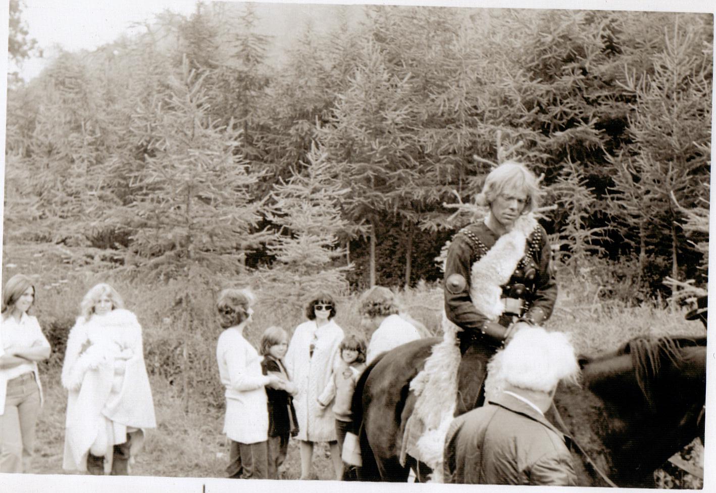 We woke up one morning to find this tent in the field beyond our house, with a full English breakfast being served by location caterers from the back of a two-tone bus. The final scenes of Episode One of the series Arthur of the Britons, entitled Arthur is Dead,starring Oliver Tobias in the title role,was to be filmed on our farm.