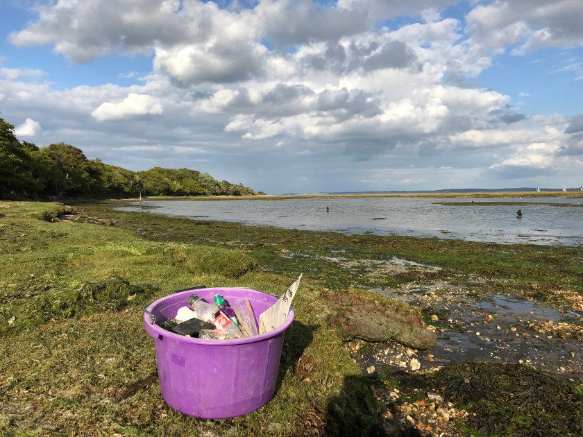 I returned to the Solent and began collecting plastic deposited by winter tides. When I first moved to this area fifteen years ago, the foreshore was multi-coloured with debris. The coast now looks clean at first glance but I picked up about 200 tiny pieces of fishing twine and micro-plastics in a few hundred yards. There were quite a few spent shot-gun cartridges left by wild-fowlers. I found a baby’s dummy and a used cigarette lighter. There is often one. New Forest ponies roam here and yet I have retrieved buckets of broken glass in the past and find a jagged bottle base that could easily lame a horse. It has obviously been there for years.