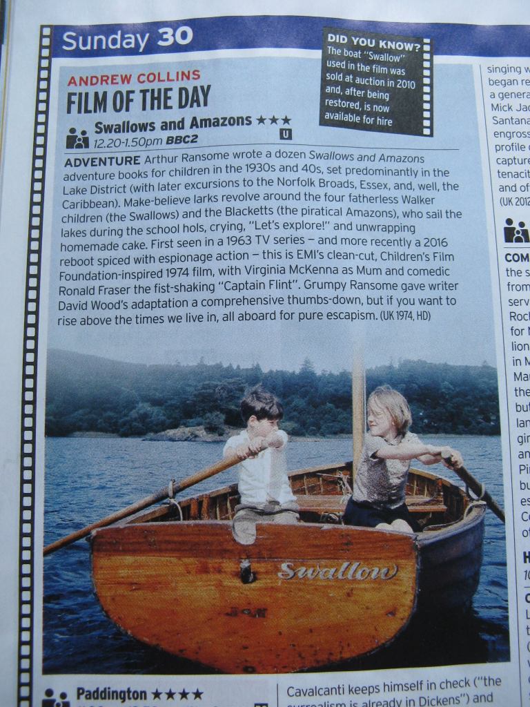 RTE Guide declared, ‘The definitive adaptation of Arthur Ransome’s ‘Swallows & Amazons’ is on BBC Two.’ More people than ever seemed to watch the classic film, starring Virginia McKenna, which attracted comments on Twitter, Facebook and Instagram while emails were being sent in.