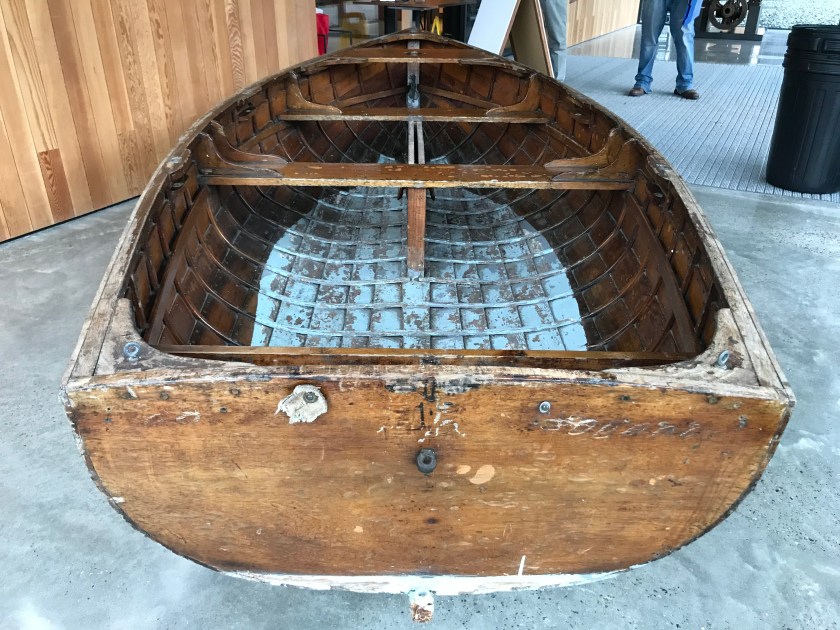 Arthur Ransome’s dinghy Conch-y-bonddhu, known as Scarab in his books, is on display with Beatrix Potter’s rough, flat-bottomed rowing boat (the pointed bows of which can be seen here hanging on the wall to the right).