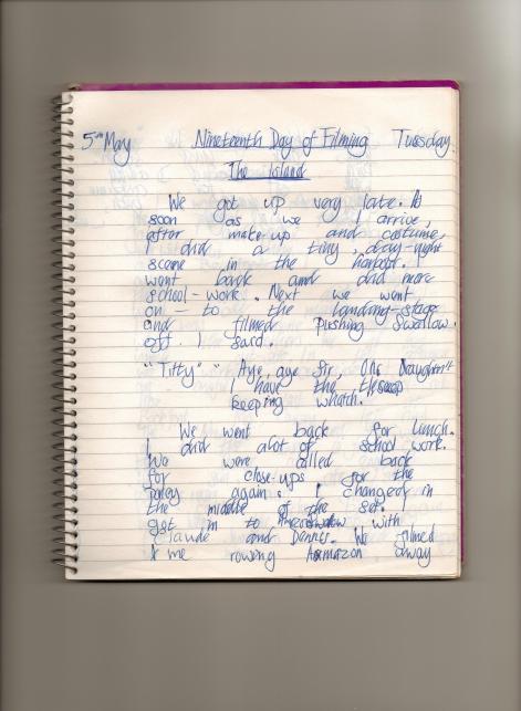 When David Wood constructed the screenplay of Swallows and Amazons he introduced dual action soon after the Swallows arrived at the island. By this I mean that he split us up a bit – John went to fetch the milk from Dixon’s farm whilst Susan and I were teaching Roger to swim. This isn’t quite as Arthur Ransome wrote but it added vitality to the script, moving it along. I reckon the Director, Claude Whatham needed to avoid a gang scenario of Five go to Treasure Island at all costs. It enabled us to get on with our school work since no one actor was in every scene. I was in all the scenes shot on this day 5th June (I wrote 5th May by mistake) but went back to my lessons whilst Claude was out on the pontoon filming John and Susan jibing Swallow – a pick-up shot set into the long shot, when I waved them goodbye from Wildcat Island, recorded on 2nd June.