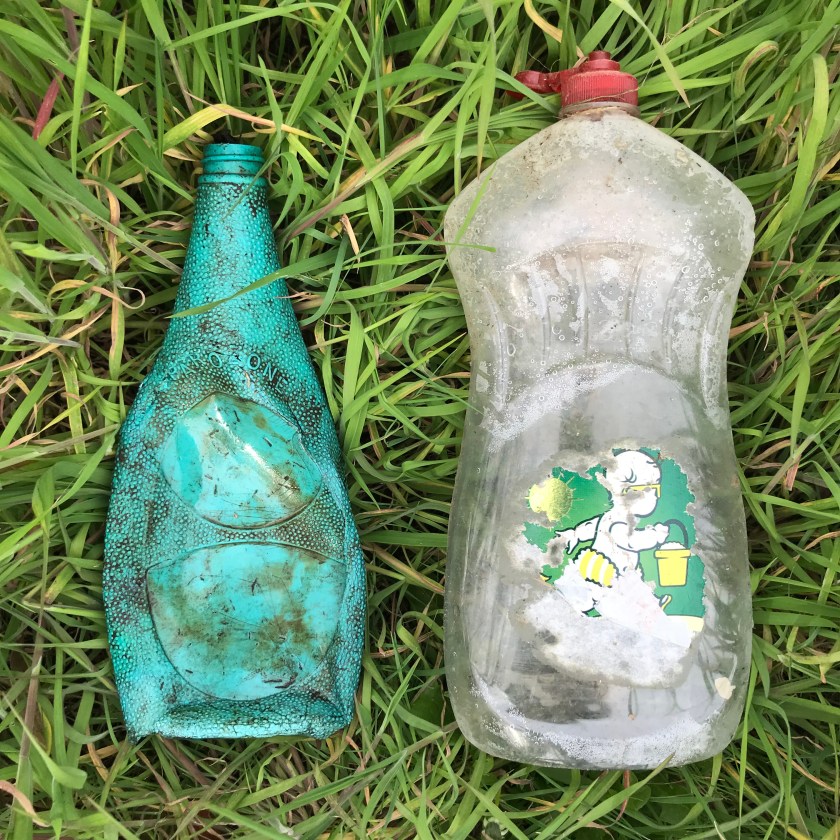 My aim is to collect bottles and ancient plastic containers lodged in the mud on a footpath running through a wood where I once found Mr-Pink-the-chemical-container in a down-and-out state. I recognise one turquoise bottle from the 1960s. The expedition takes 90 minutes.