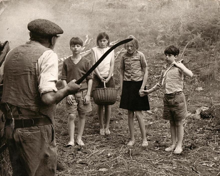 Jack Woolgar as Old Billy confronting Simon West, Suzanna Hamilton, Sophie Neville and Stephen Grendon as the Swallows who were visiting the charcoal burners.