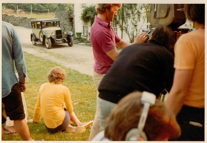 Director Claude Whatham, in a 1970s yellow long-sleeved t-shirt, watching the taxi drive up to Mrs Jackson’s front door in 1929. DoP Dennis Lewiston sets up the shot with Focus-puller Bobby Sitwell ~ photo: Daphne Neville (c)