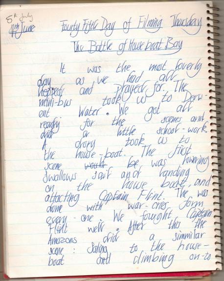I wrote more enthusiastically about playing Consequences in Bank Ground farmhouse. This is the game that Virginia McKenna had introduced us to and we loved it. This time we must have roped in heads of the Costume, Hair and Make-up Departments. It seems that Emma Porteous, the Costume Designer, was on set with us that wet day in May. I would think that this was when they recorded the scenes inside Holly Howe with Susan and Roger and the wonderful lady who played Mrs Jackson. Someone recently asked why Susan never thanked her for lending her the frying pan, as it seemed out of character, but she still wasn’t feeling very well. Does Susan thank Mrs Jackson in Arthur Ransome’s book?