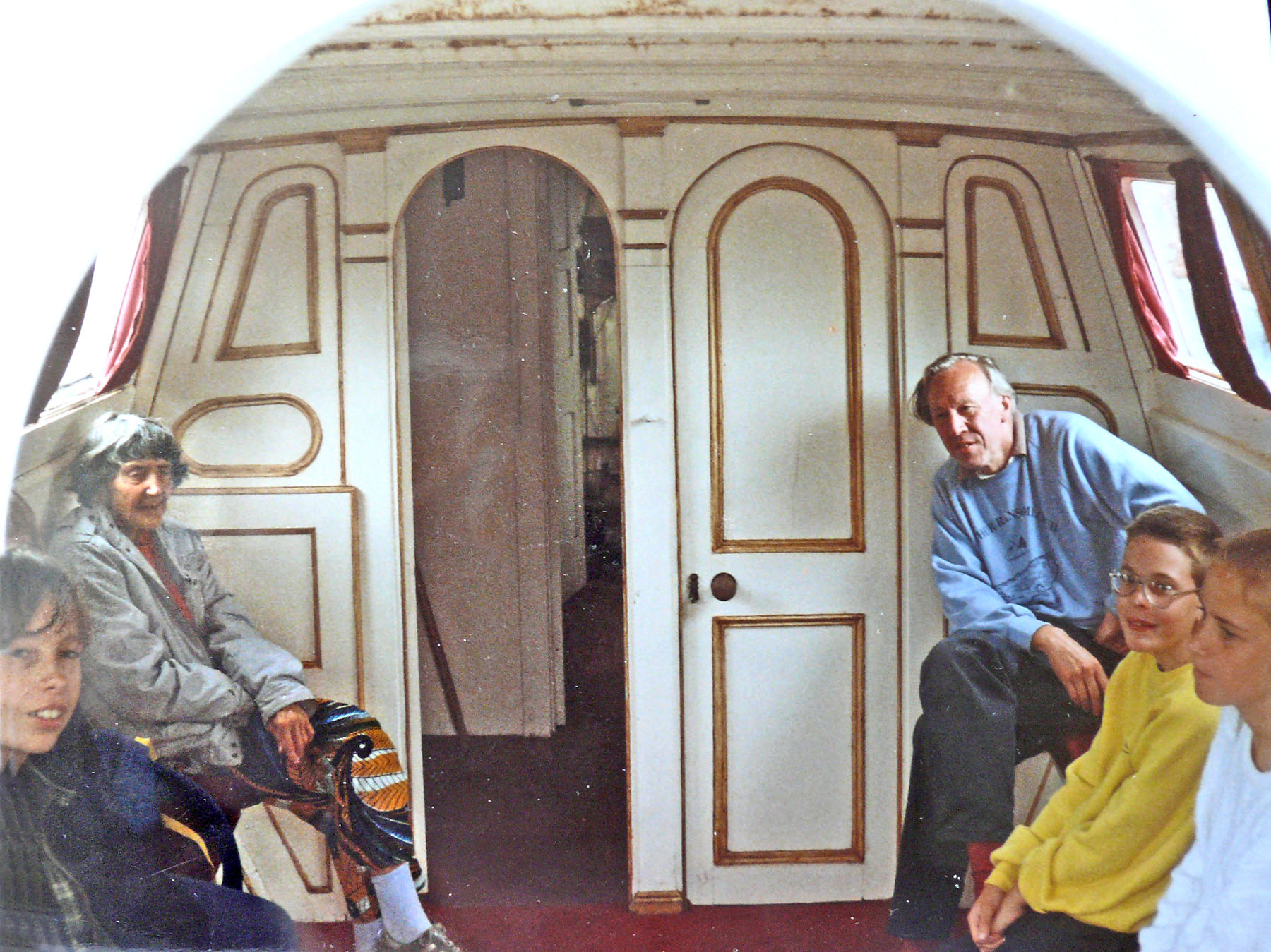 Taqui Altounyan with Roger Wardale and some of his former pupils inside the Esperance, which was the model for Captain Flint’s houseboat