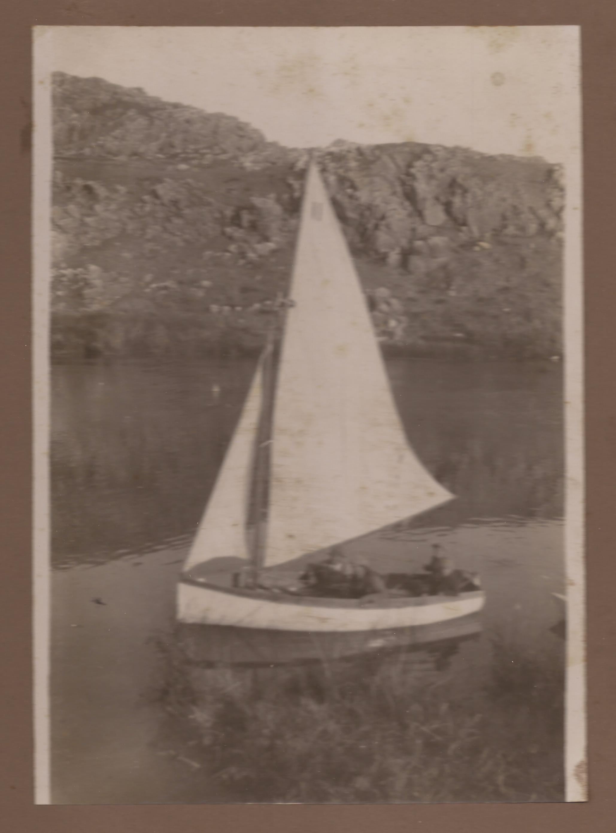 I knew the little ship intimately. She looked a bit dried out but my husband thought we ought to buy her. I had played the part of Able-seaman Titty, the nine year-old girl who Ransome so cleverly made into the heroine of the story when she grabbed a chance to capture the Amazon, which enabled the Swallows to win the war set to determine ‘who should be the flag-ship’. In mooring her prize overnight near Cormorant Island, Titty witnessed Captain Flint’s stolen treasure chest being buried and was eventually able to rescue it. She was rewarded by the gift of a green parrot.