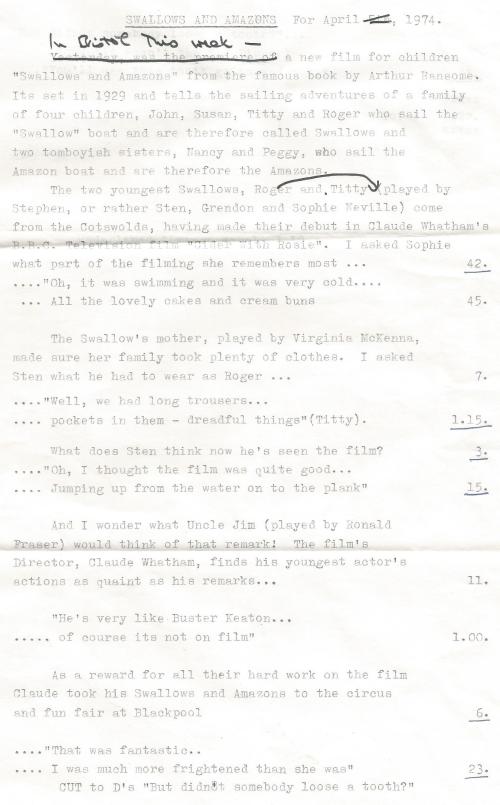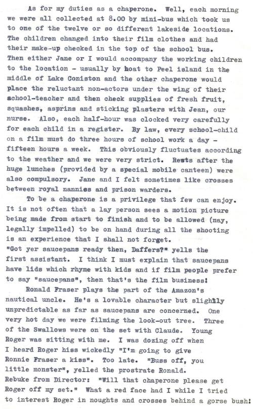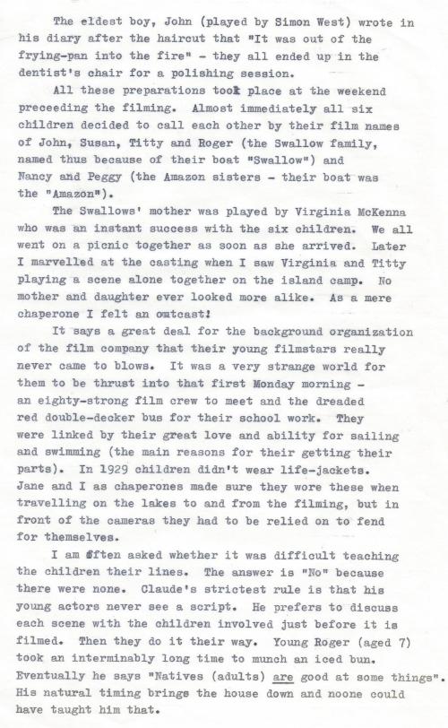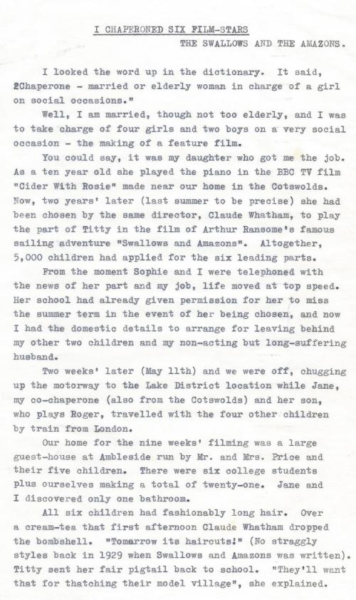 In 1974, my mother, Daphne Neville, was commissioned to write an article about working on the original film of ‘Swallows and Amazons’ for Woman magazine, which claimed to be ‘The world’s greatest weekly for women’. Here are some extracts from her type script: