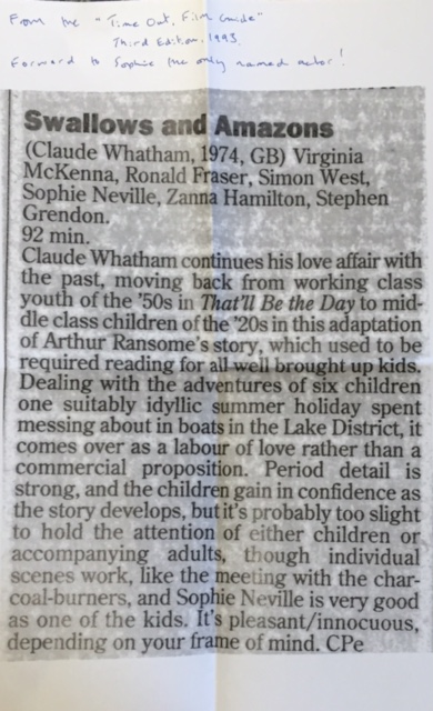 It had not occurred to me that the film was recorded in the annals until I was sent this excerpt from the third edition of ‘Time Out Film Guide’ (1993). Perhaps I should bring out a third edition of ‘The Secrets of Filming Swallows and Amazons’.