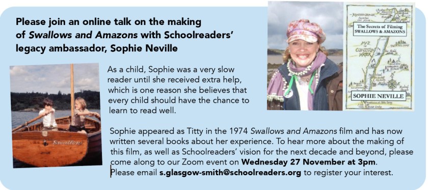 On Wednesday 27th November at 3.00pm, I will be giving another talka about ‘The Making of Swallows and Amazons’ on a Zoom hosted by the national child literacy charity Schoolreaders.