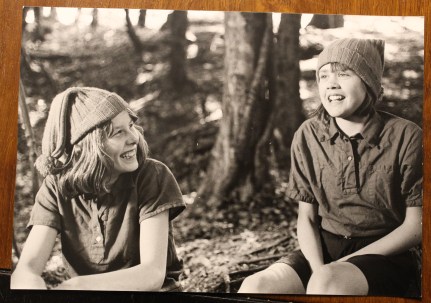 Lesley had brought along a blue file of documents and a number of black and white movie stills that she’d been given by Richard Pilbrow, the producer of ‘Swallows and Amazons’ (1974) on one of our last days in Ambleside after filming had finished. We could both remember them spread out on a table at the unit hotel so we could each chose the ones we appeared in. I had picked one where Lesley and I are sitting together, our hair bobbed in line with the 1930’s, I wearing a cream silk dress, Lesley in a dark top looking very pretty: